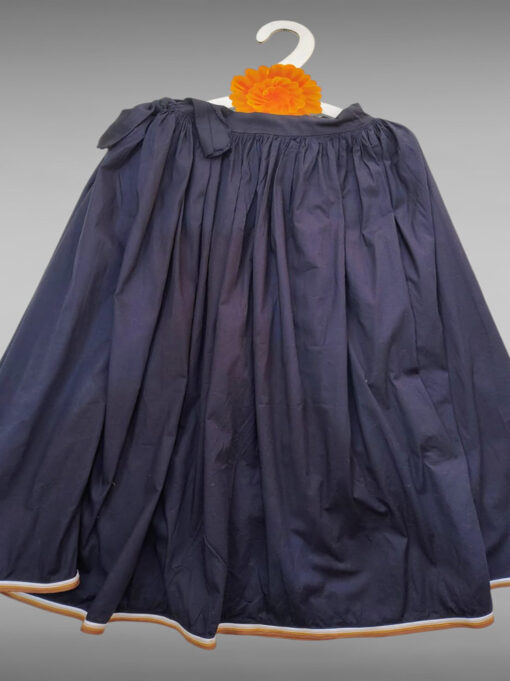 Una prenda que refleja la tradición textil Huichol, confeccionado a mano, destaca por su delicadeza en tono azul marino y bies de 3 colores sobre tela algodón.