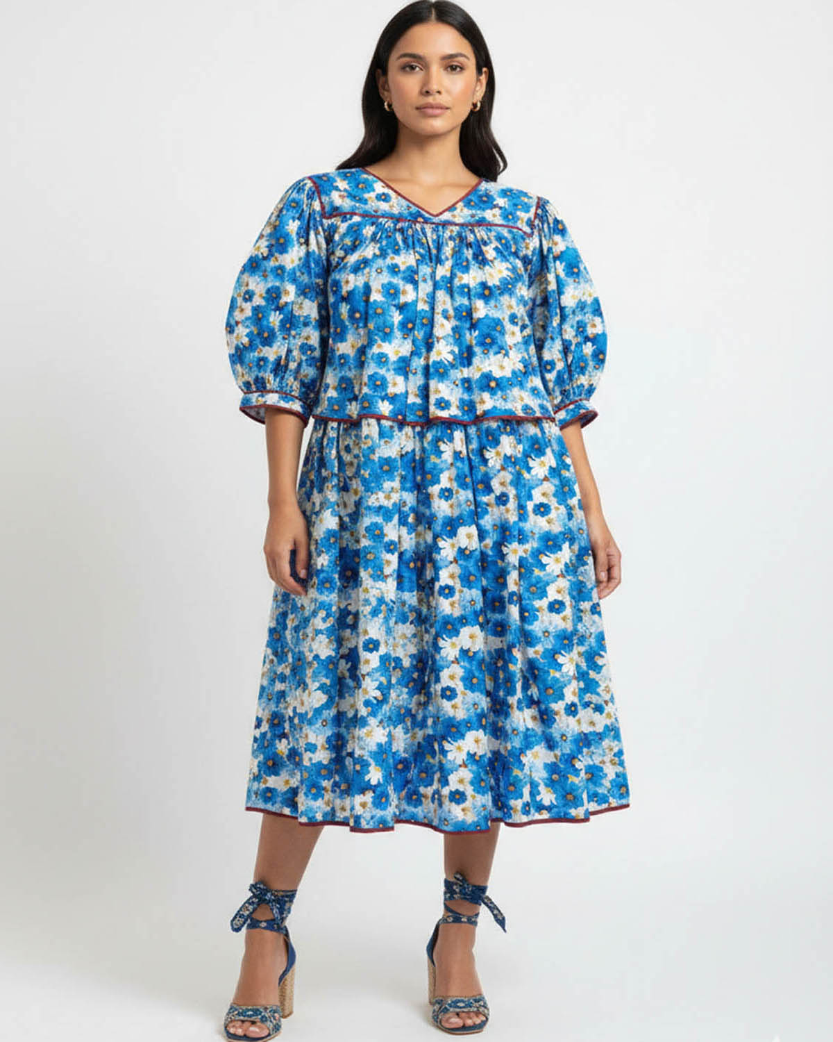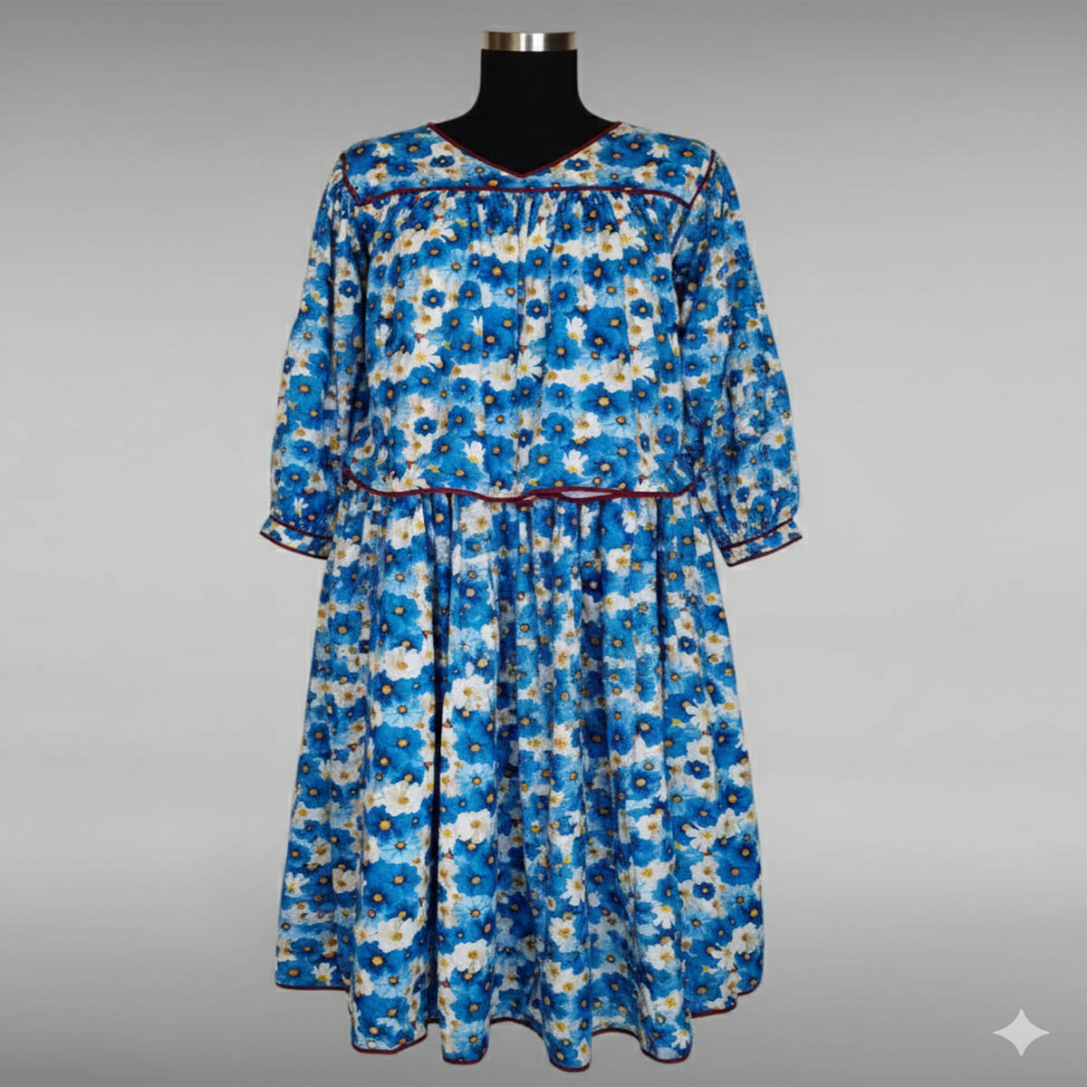 Falda con blusa tradicional elaborado con tela de algodón, bies en la orilla de la falda.