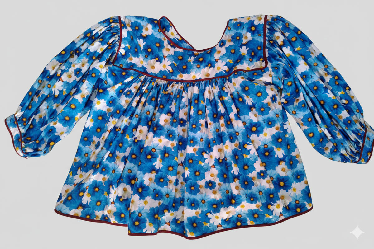 Una prenda que refleja la tradición textil Wixàrika, confeccionado a mano, destaca por su delicadeza en tono azules y bies de color vino sobre tela algodón.