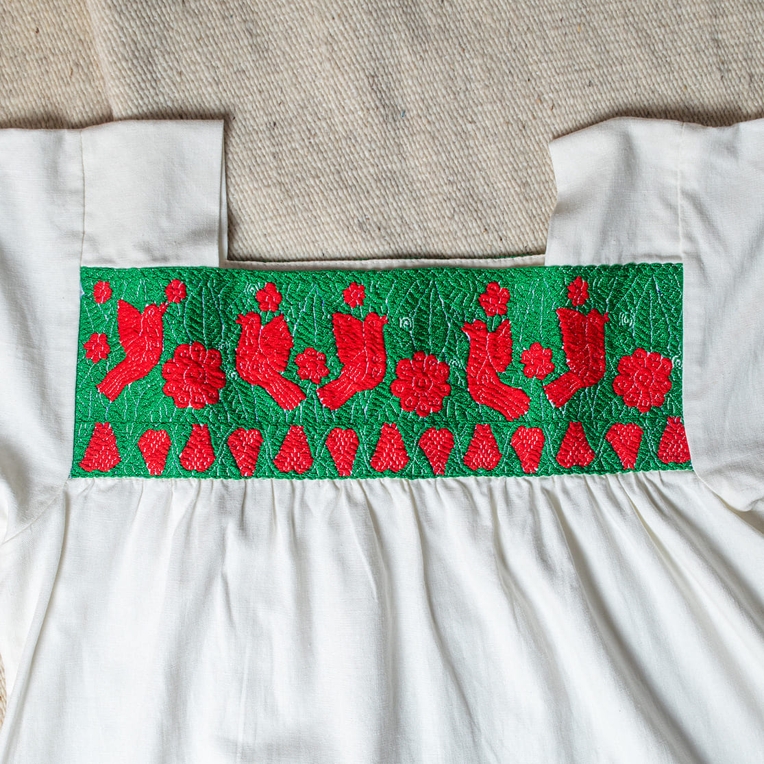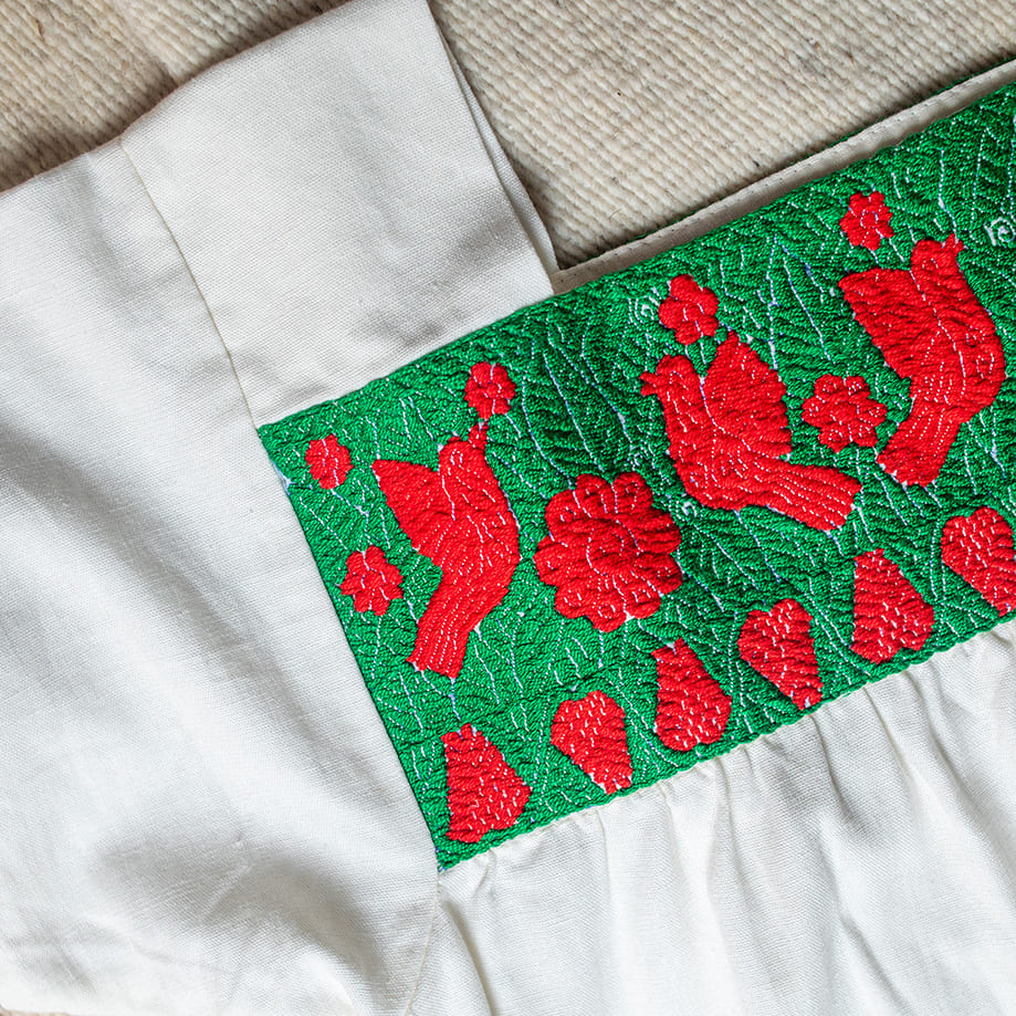 Inspirada en la riqueza cultural de la Sierra Norte de Puebla, esta blusa confeccionada en lino y bordada a mano con hilo de seda refleja la maestría artesanal nahua. Sus delicados bordados en verde y rojo aportan un toque de elegancia atemporal, perfecta para quienes buscan un estilo con raíces profundas y diseño sofisticado.