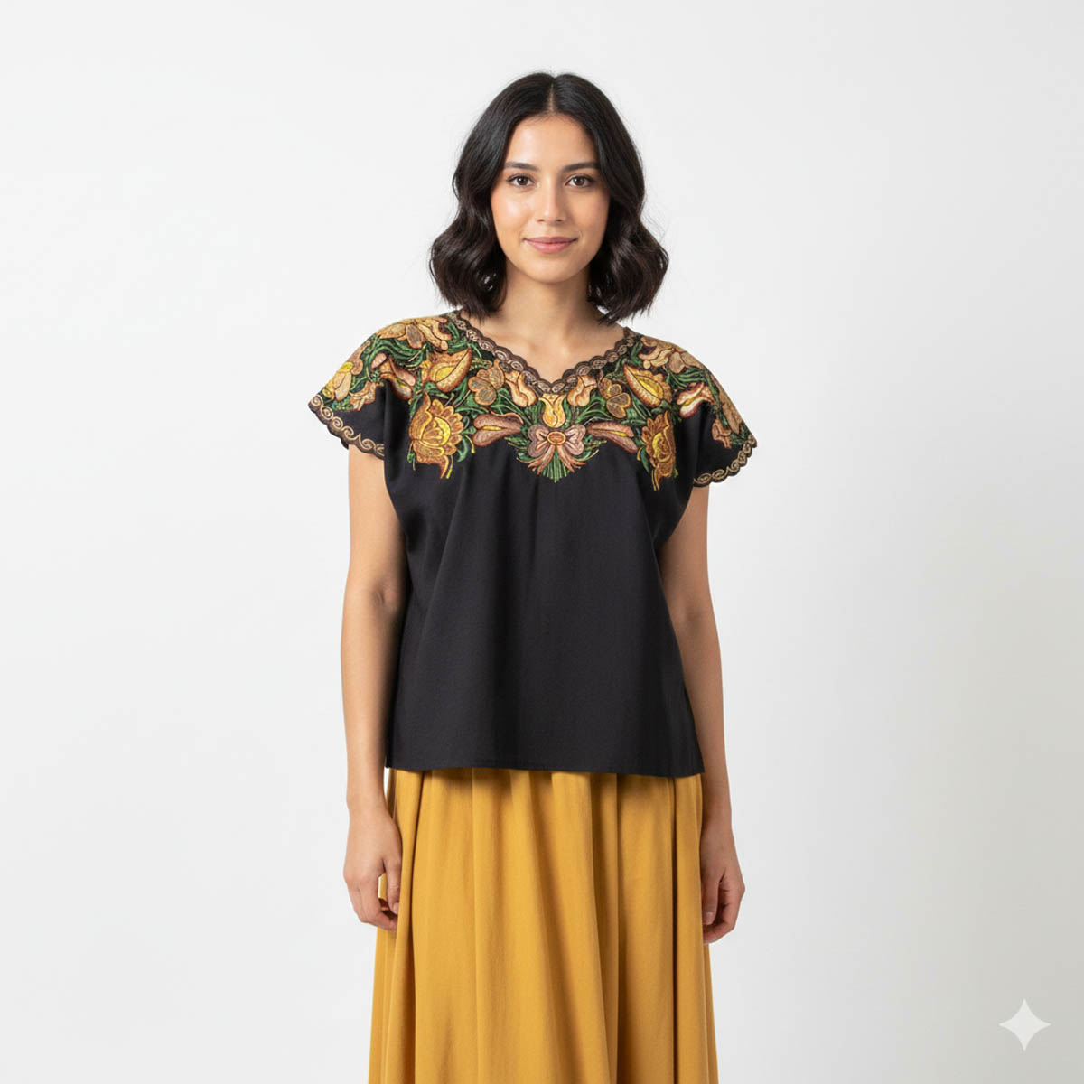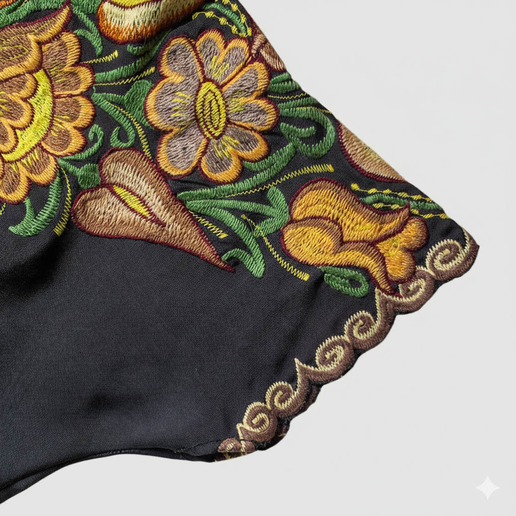 🎨 Color: Tela negra con bordados en tonos café, verde y amarillo