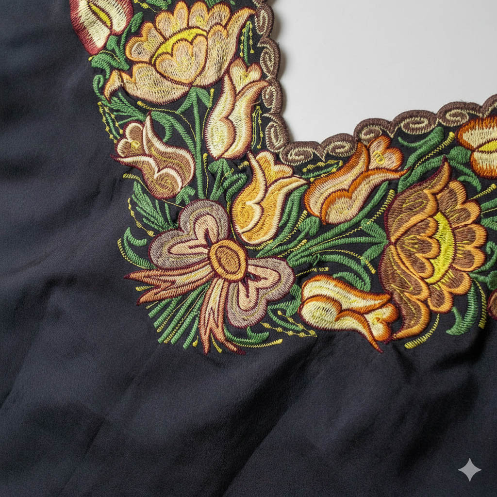 🧵 Técnica: Bordado a máquina de pedal con diseños florales tradicionales