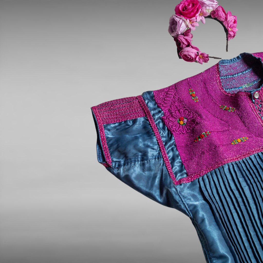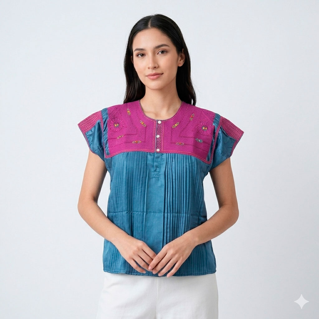 Color, textura y tradición se unen en esta blusa bordada a mano con técnica rococó, sobre tela de raso azul petróleo y rosa mexicano. Sus acabados en espiguilla y listones finos le otorgan un detalle delicado y auténtico.