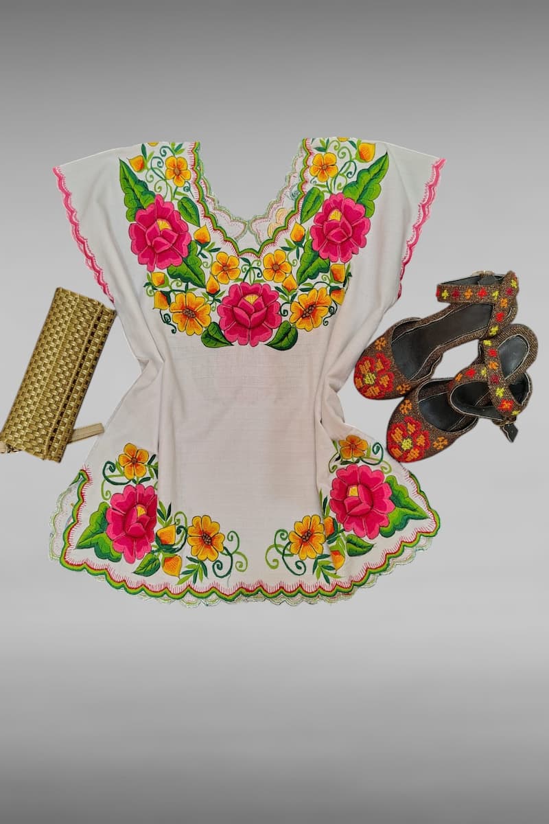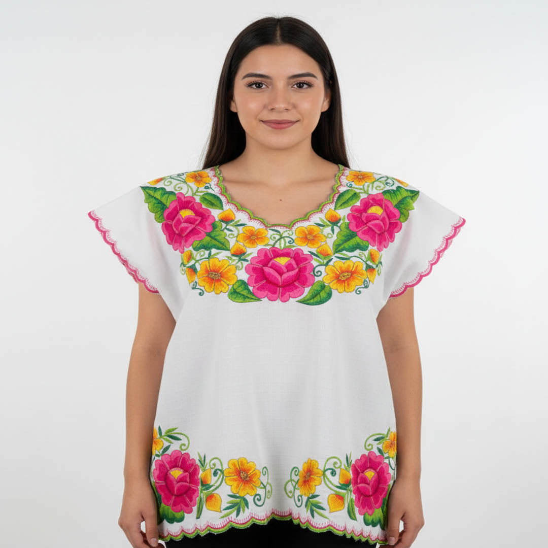 Blusa artesanal originaria de Maní, Yucatán, confeccionada en tela fresca y ligera, ideal para el clima cálido de la región. Se distingue por su bordado realizado en máquina de pedal, una técnica tradicional que combina destreza artesanal con precisión, transmitida de generación en generación entre las bordadoras mayas.