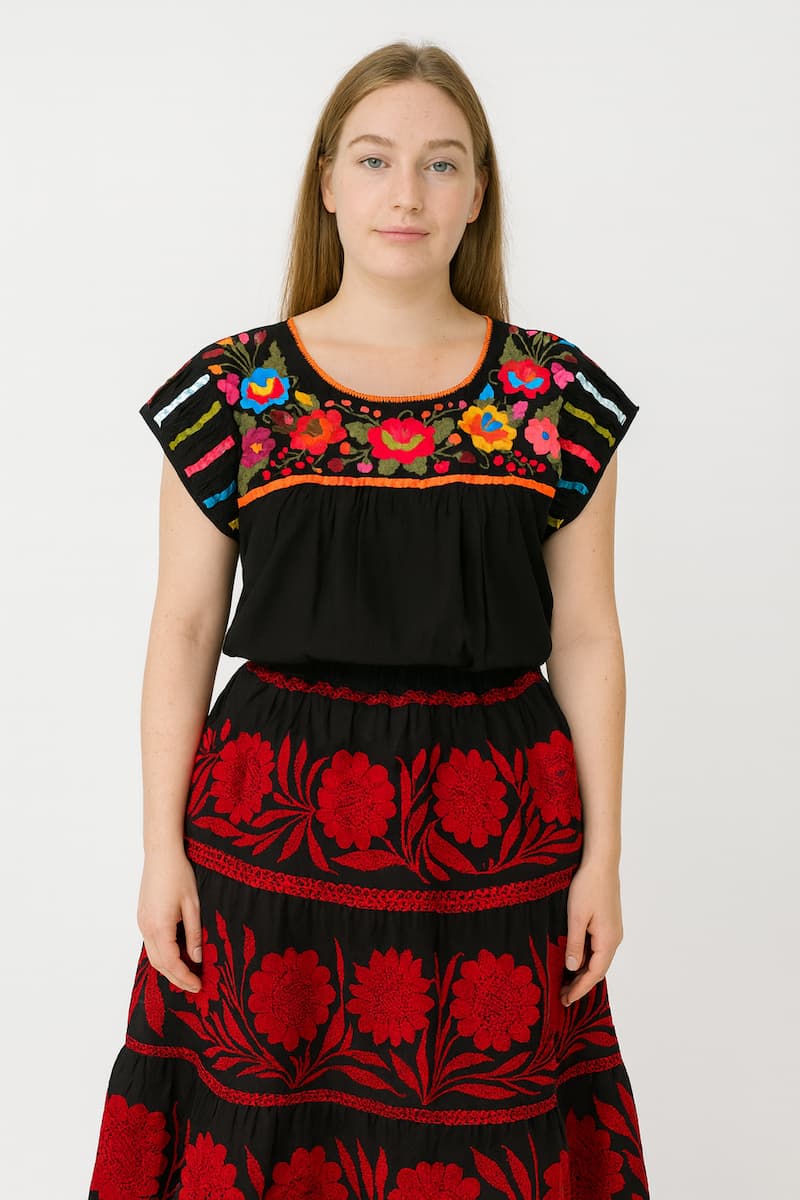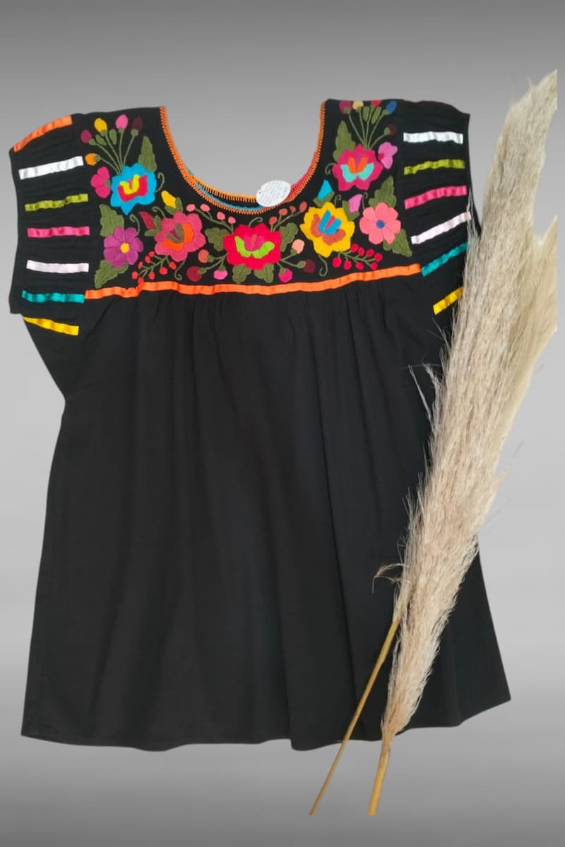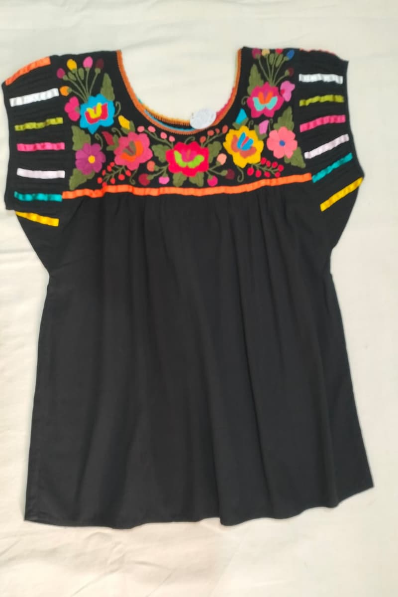 Blusa tradicional elaborada en manta negra con bordado a mano multicolor.
