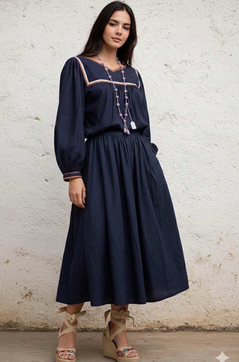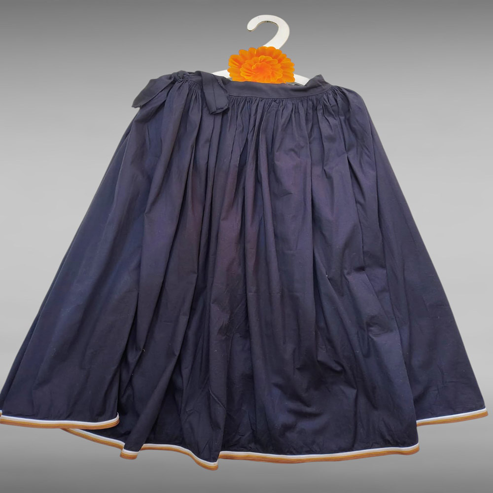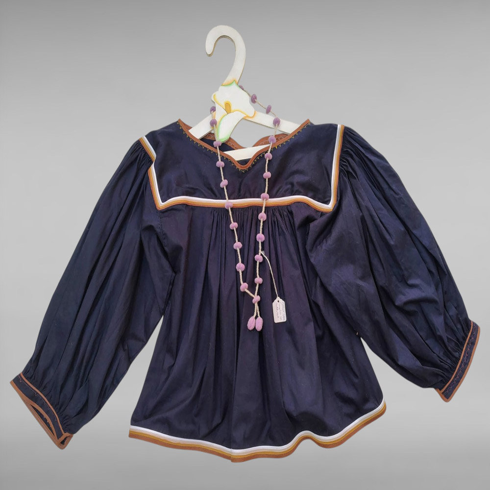Una prenda que refleja la tradición textil Huichol, confeccionado a mano, destaca por su delicadeza en tono azul marino y bies de 3 colores sobre tela algodón.