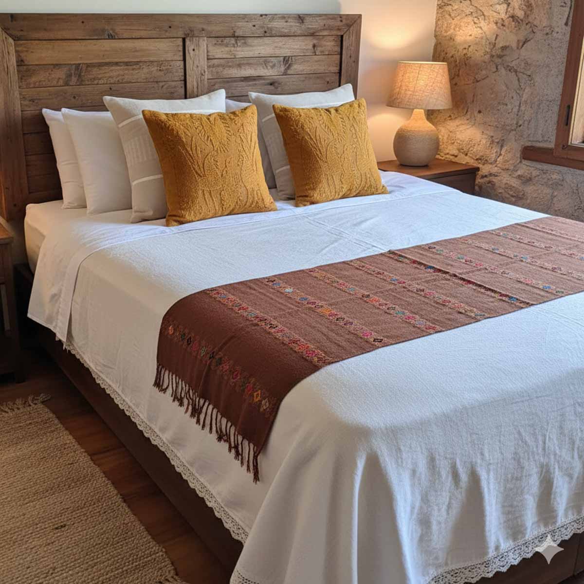Un camino de mesa cálido y artesanal, perfecto para ambientes neutros que buscan un acento tradicional.