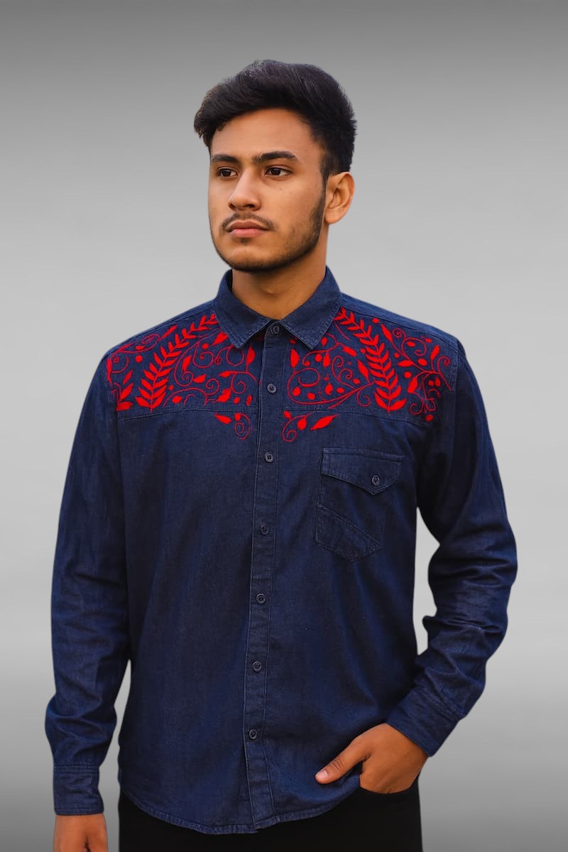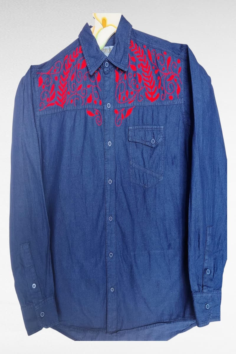 Camisa de tela comercial con bordado tradicional Otomí a mano con hilos de algodón color rojo. Este bordado está profundamente arraigado en la cultura de muchas regiones, reflejando identidades y tradiciones locales con motivos únicos.