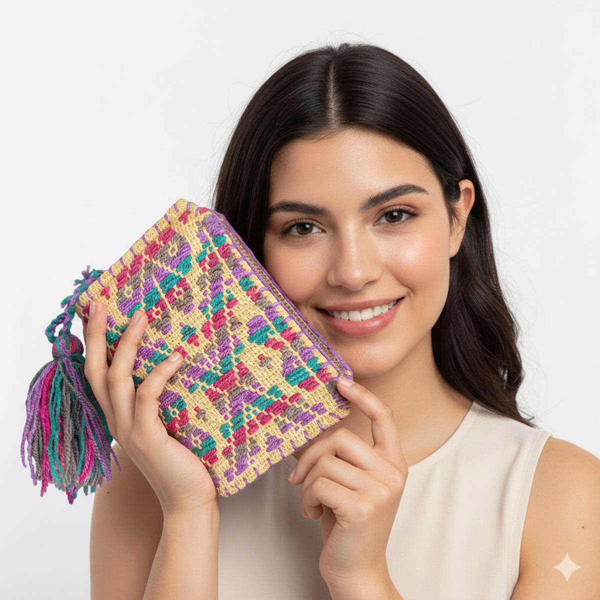 ✨ Accesorios, complemento de la vestimenta tradicional como elemento decorativo, destacando por guardar accesorios como tarjetas, dinero, además de representar el compromiso con la preservación de las técnicas artesanales de artesanas Mazahuas.