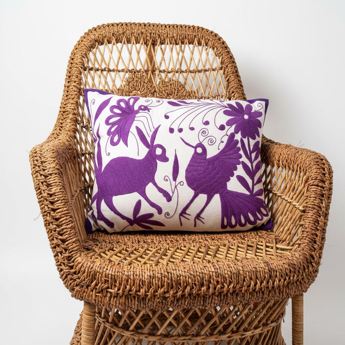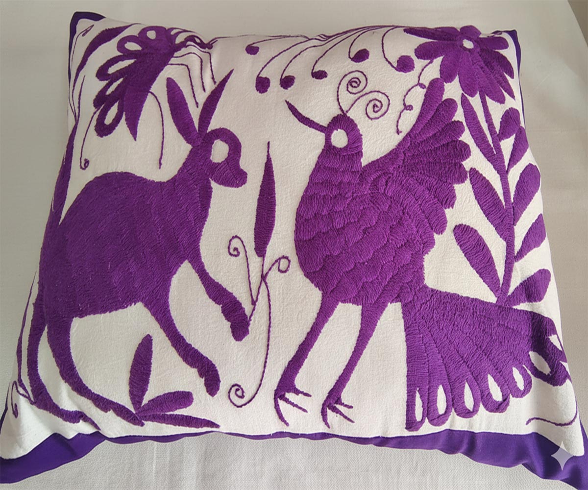 Cojín de tela algodón con bordado en manta natural otomí a mano.