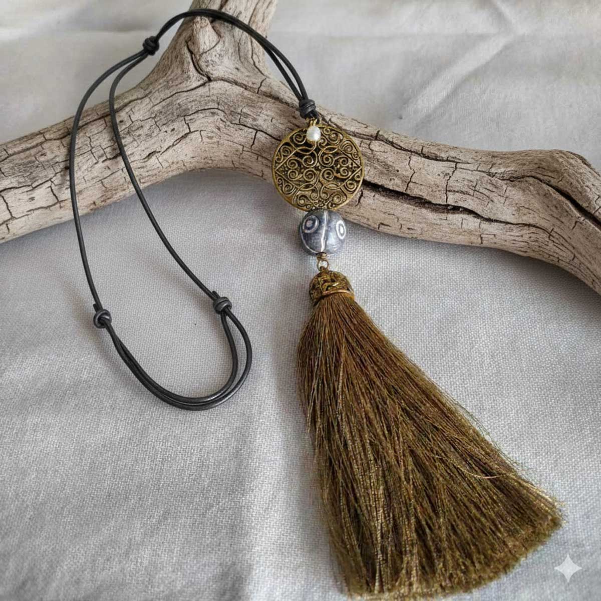 Collar largo Folk artesanal elaborado a mano con latón, perlitas de rio, bolas de cerámica y Cordón de piel con pompón, mujeres de Istmo y Diseñadora Pilar Miranda.
