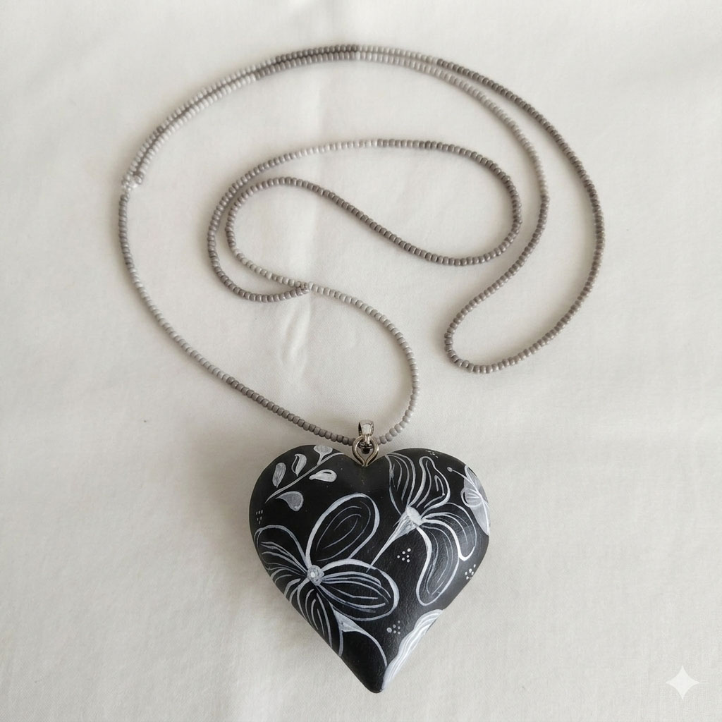 Collar largo de corazón alebrije de madera elaborado y pintado a mano con cordón de chaquira.