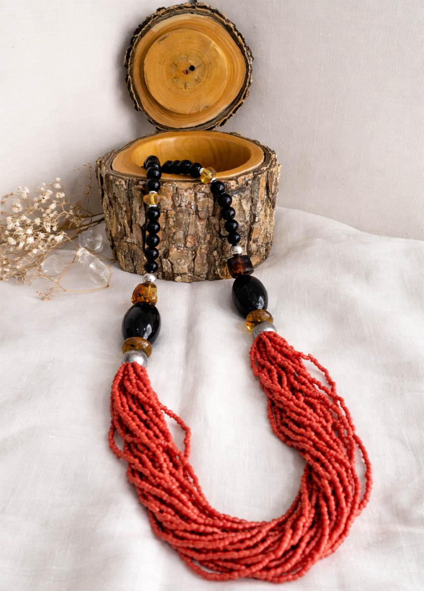 Collar artesanal de diseño étnico y elegante, elaborado con una combinación de cuentas negras de piedra natural, detalles en tonos ámbar y separadores metálicos plateados que aportan contraste y sofisticación.