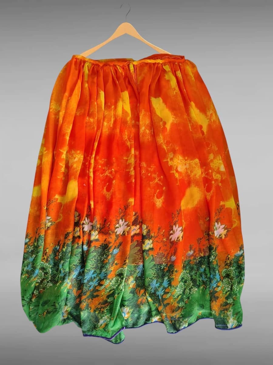 Falda Huichol confesionada con tela comercial ligera y bies en la orilla con forro, elaborada por mujeres Wixàrika. Inspirada en la identidad y tradicional Wixàrika, esta falda es una expresión única de la conexión con la naturaleza, la usan en sus fiestas ceremoniales y en su vida diaria.