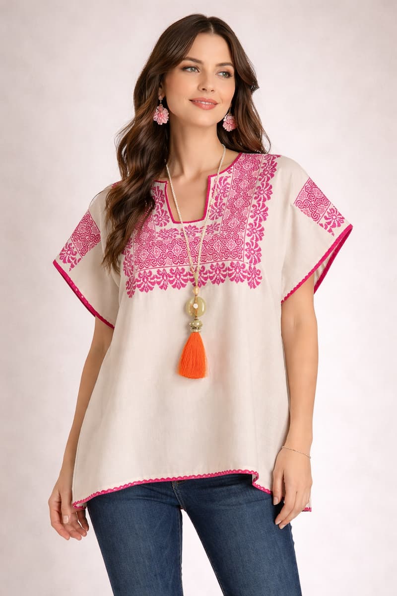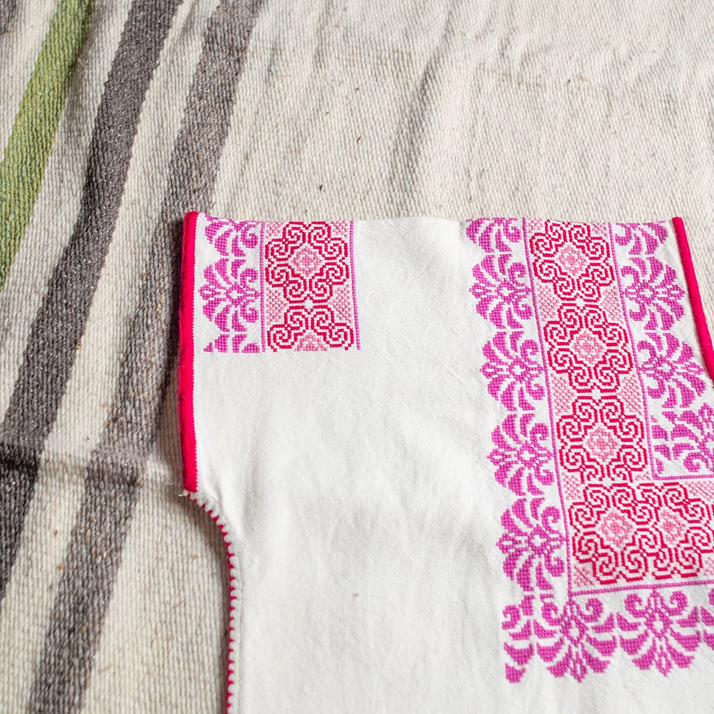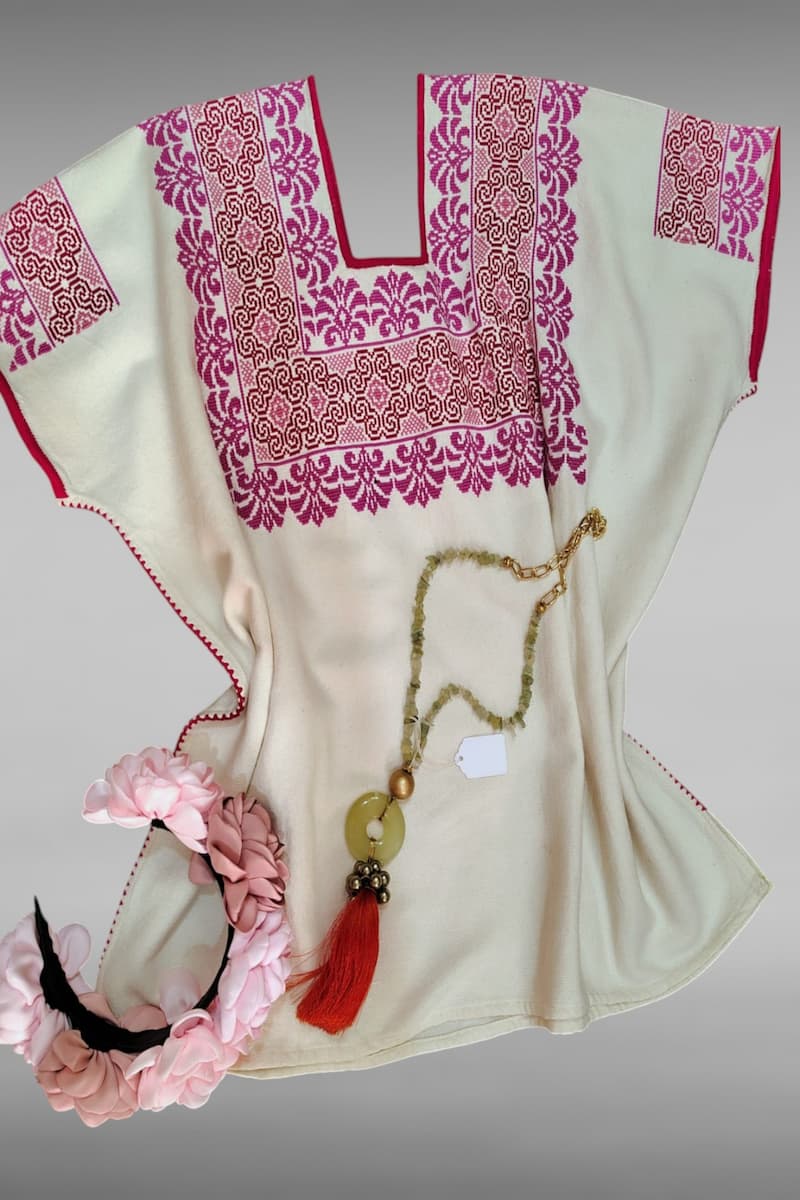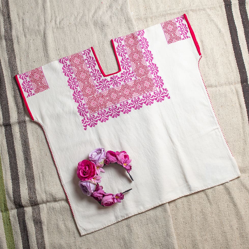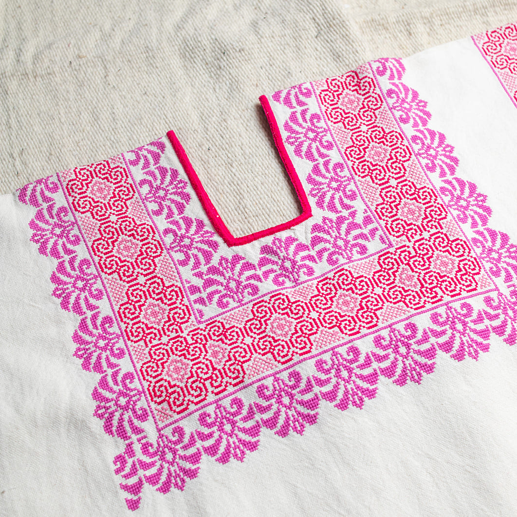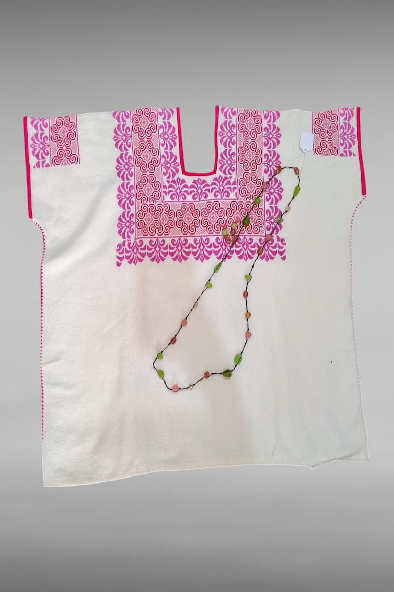 El guanengo purépecha es un símbolo de identidad cultural. Elaborado en telar de pedal y bordado en punto de cruz fino, este diseño en algodón natural con bordados en rosa mexicano transmite la fuerza y delicadeza del arte purépecha.