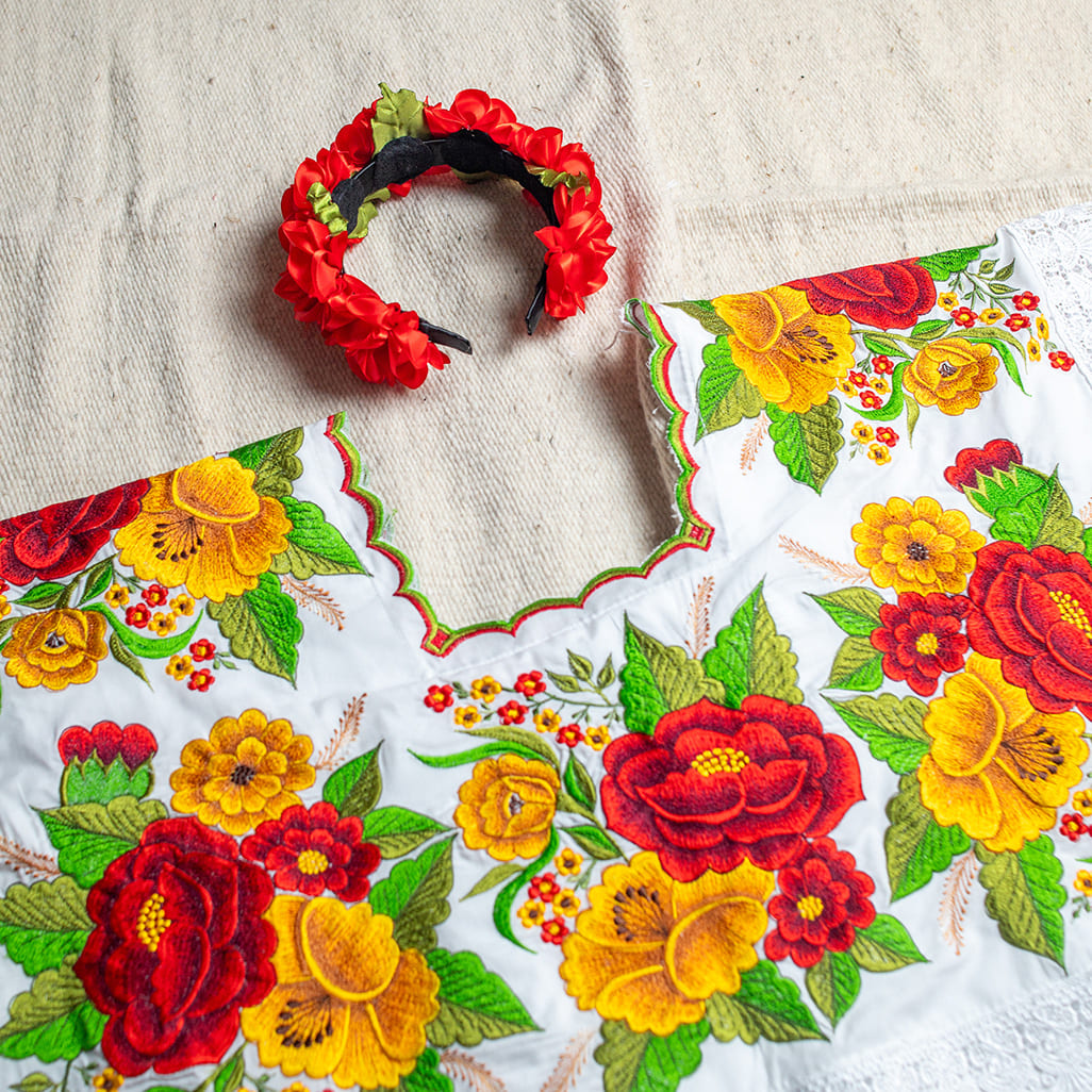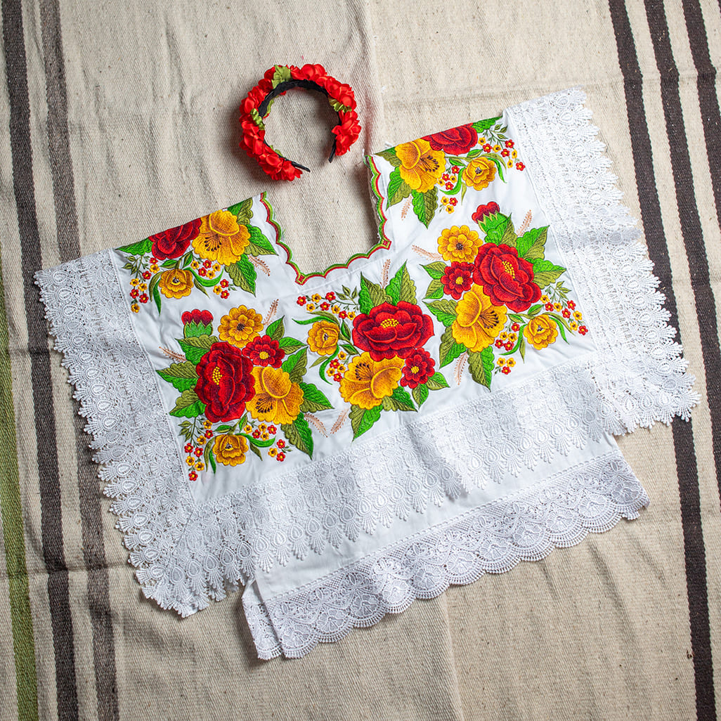 El hipil de Maní es un símbolo del mestizaje cultural entre raíces mayas y españolas. Confeccionado en algodón y bordado a máquina de pedal con hilos de seda, luce flores en tonos vivos y detalles de guipur en el jubón. Una prenda que transmite elegancia y tradición.