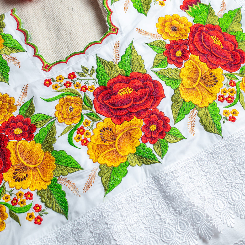 🎨 Color: Blanco con bordados en rojo, verde y amarillo