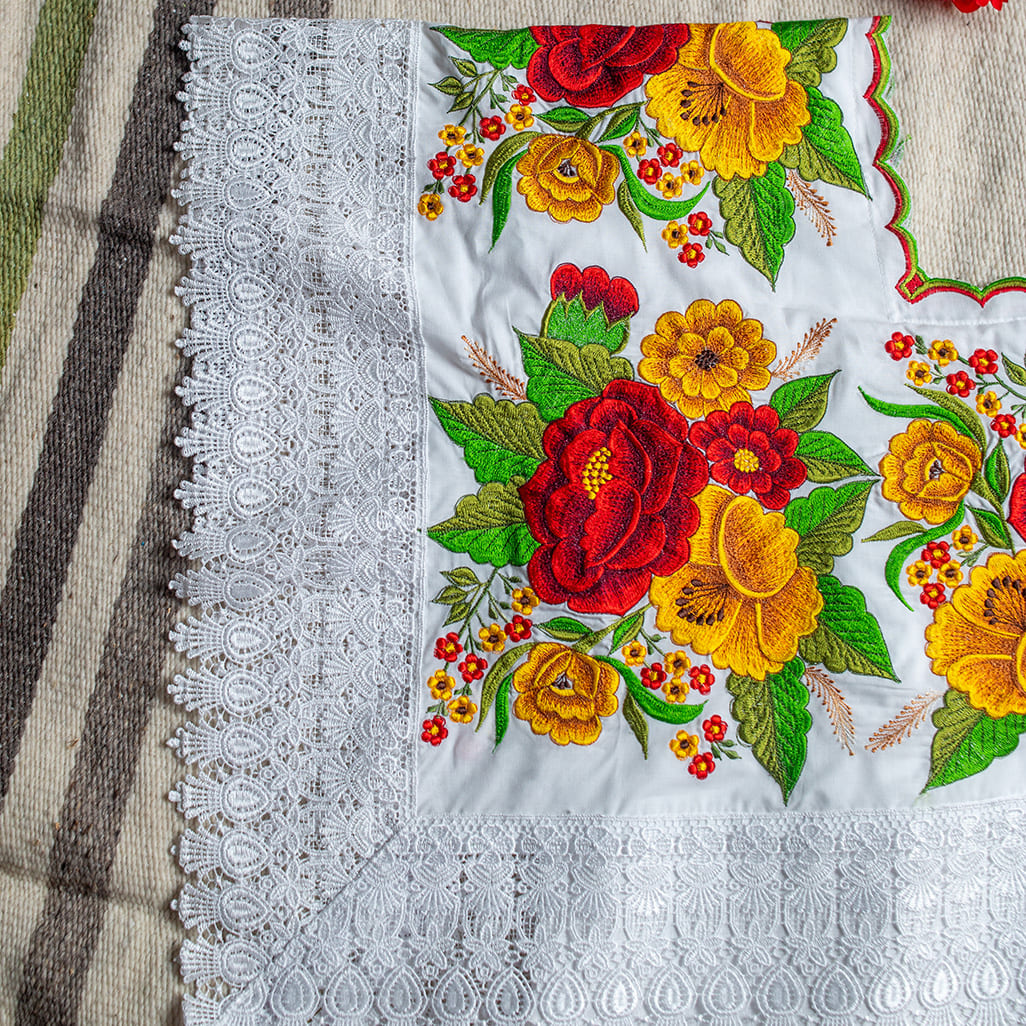 🧵 Técnica: Bordado a máquina de pedal con diseños florales tradicionales
