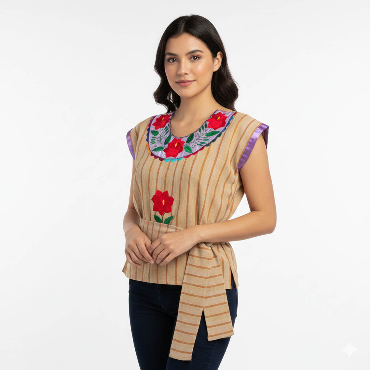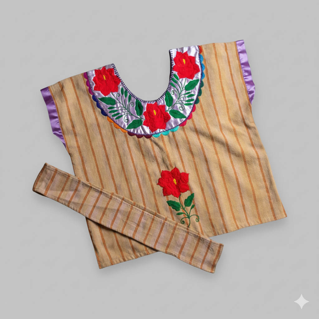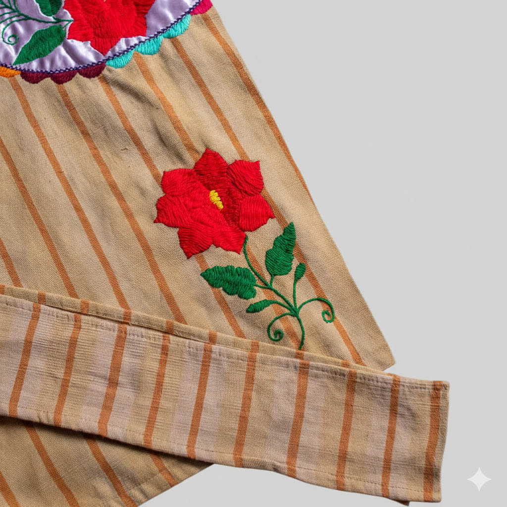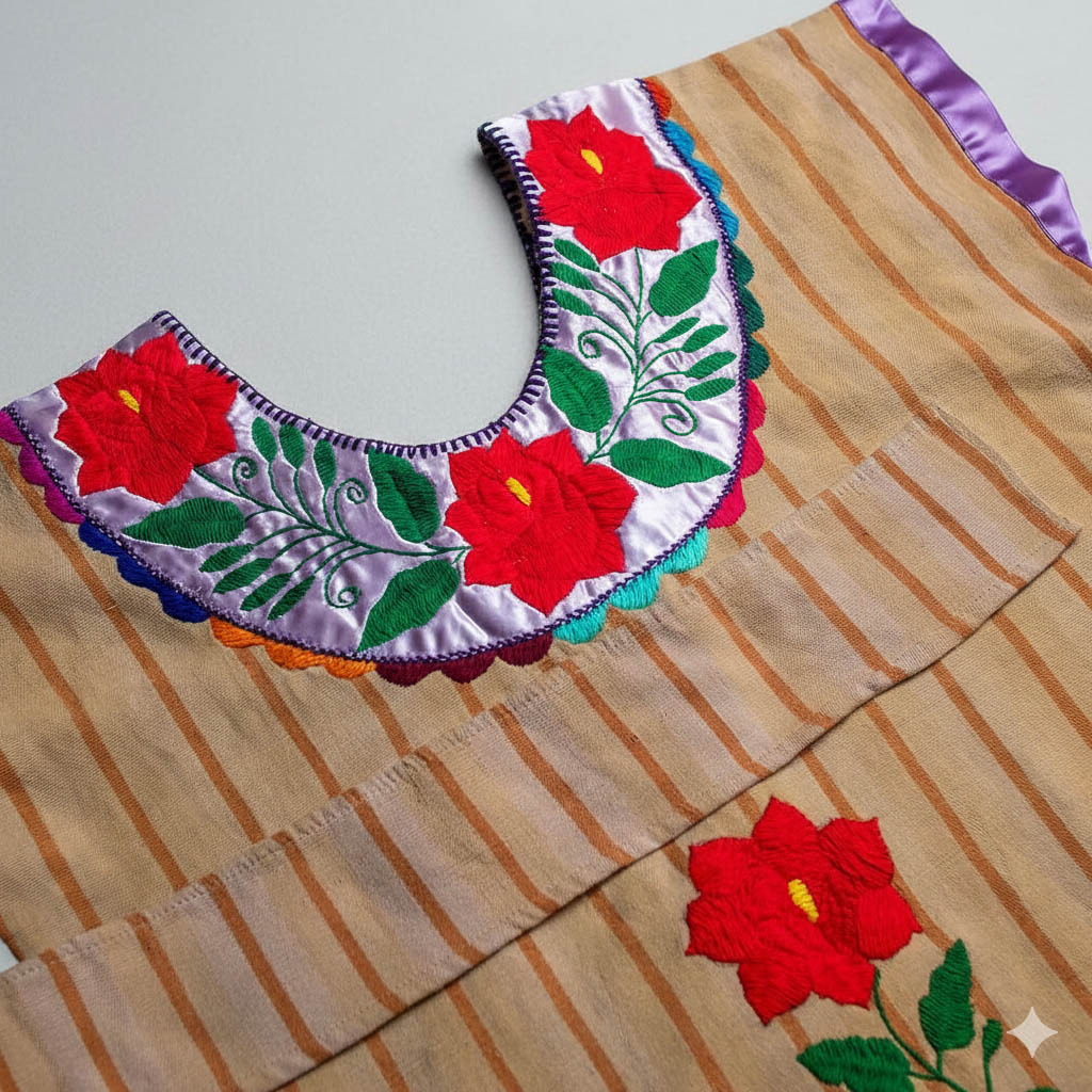 🎨 Color: Beige claro y oscuro con bordados en tonos rojos, verdes y lilas