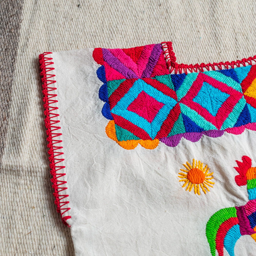 Una prenda que encierra la esencia de Oaxaca. Confeccionada en manta natural y bordada a mano en punto de cruz y otras técnicas tradicionales, esta pieza luce diseños geométricos y figuras de animales llenos de color. Los acabados en mangas, cuello e inferior en hilaza y guipur rojo le otorgan un carácter único.