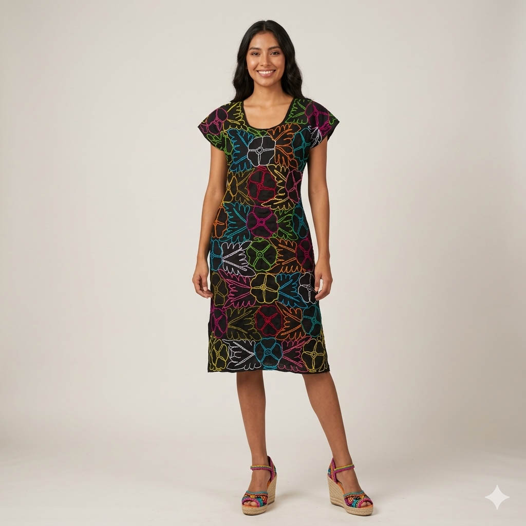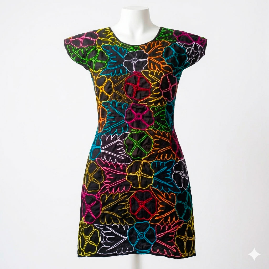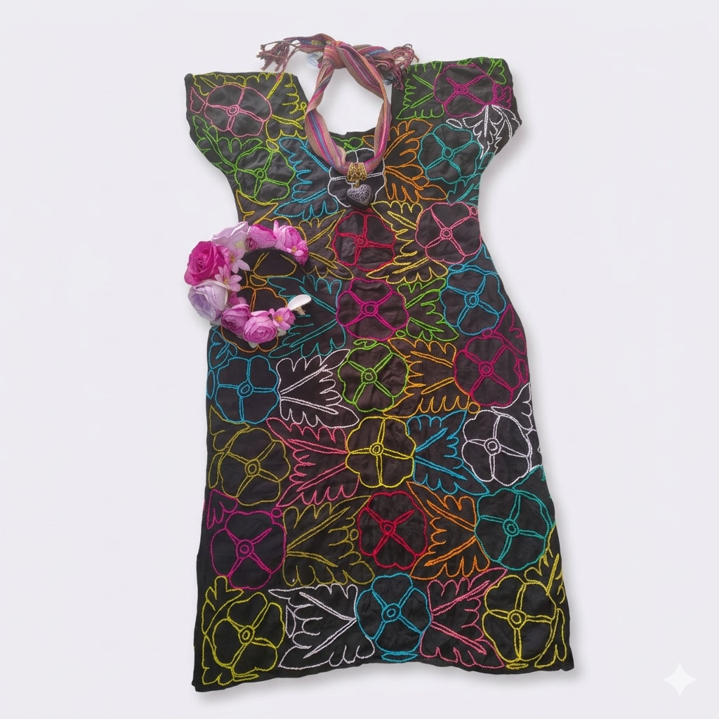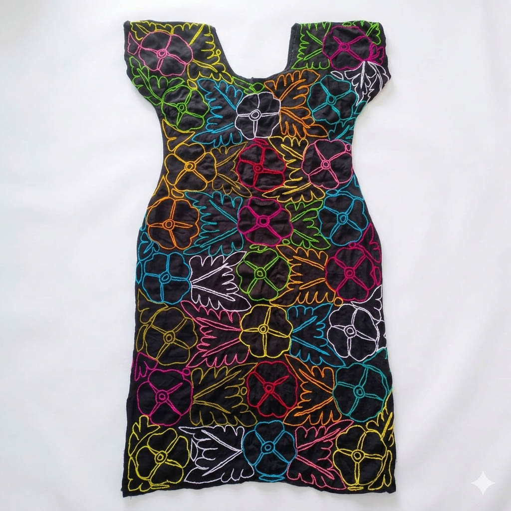 ✨ Una prenda para vestimenta que refleja las técnicas tradicionales ancestrales que contemplan y destacada por su delicadeza en tonos multicolores y su confección en manta de algodón color negro.