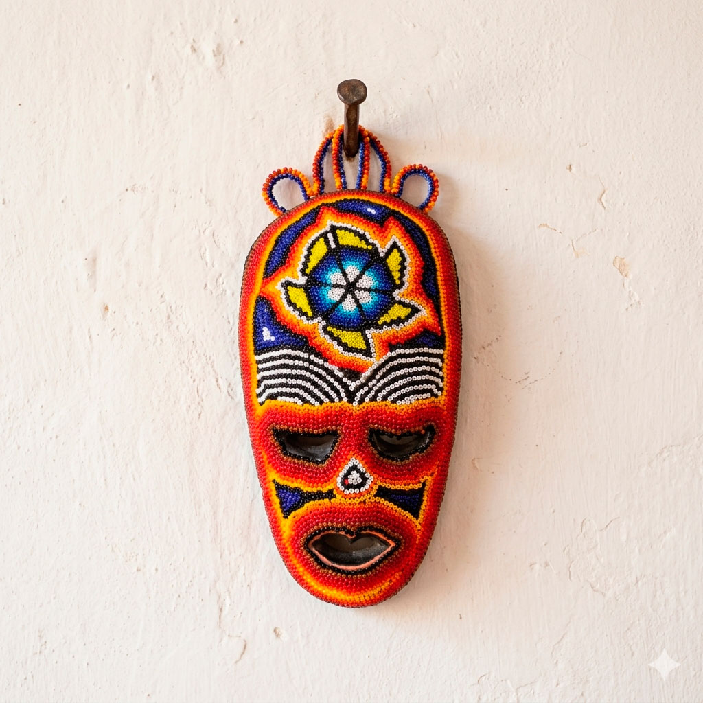 Esta mascara escultural es una pieza única de chaquira. Ideal para decorar con identidad, historia y creatividad mexicana.