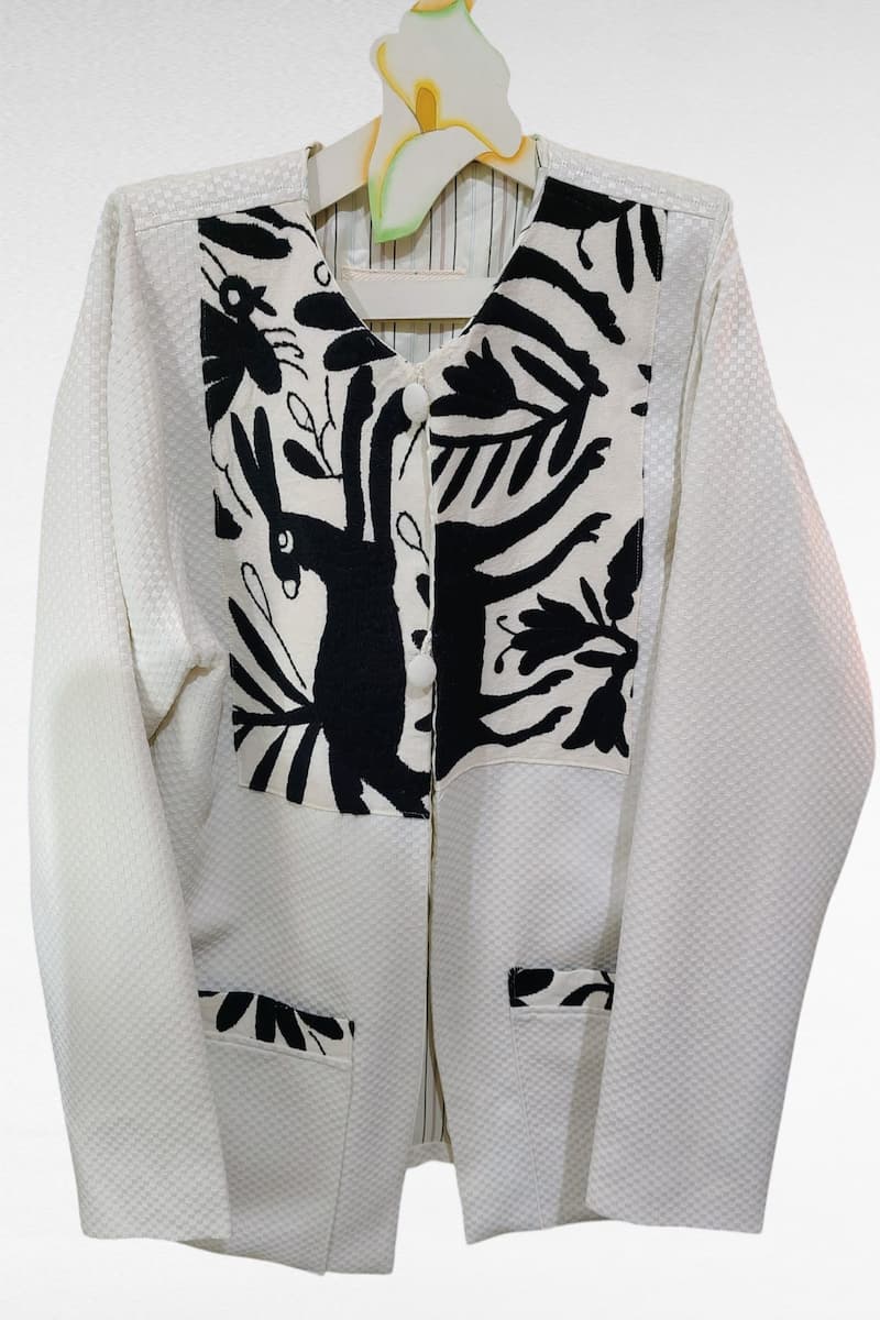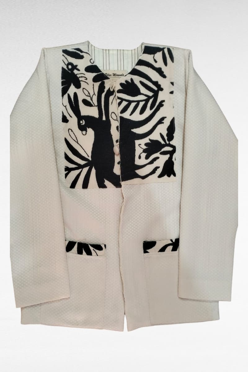Saco contemporáneo con bordado a mano Otomí. Inspirada en la riqueza cultural de la Sierra Norte de Puebla, este saco confeccionado en algodón y bordada a mano con hilo refleja la maestría artesanal Otomí. Sus delicados bordados y aportan un toque de elegancia atemporal, perfecta para quienes buscan un estilo con raíces profundas y diseño sofisticado.