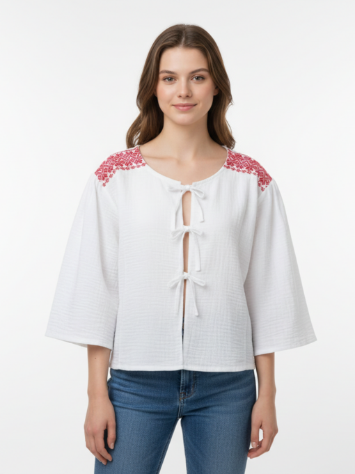 Una prenda que refleja la tradición textil de Chila Puebla, bordada a mano, destaca por su delicadeza en tono café y su confección en tela algodón de color chedròn natural.